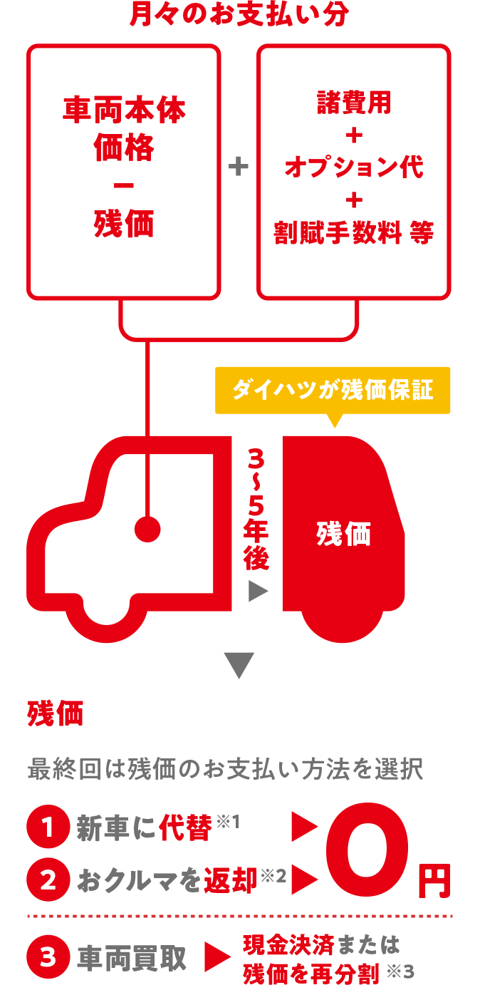 ●設定残価は、車両状態が規定内である場合のみ保証いたします。●ご購入いただいた販売会社に車両をご返却の上、新車にお乗り換えの場合(※1)、およびご購入いただいた販売会社にご返却の場合(※2)、残価分のお支払いは不要ですが、車両状態が事前に定められた規定外である場合には、別途精算金をいただきます。●最終回でお買い上げ(現金決済・再分割)をご選択された場合、最終回のお支払額(残価)を含めたお支払合計額は、一般的なローンの方が軽くなる場合があります。●お買い上げの際に再分割も選択できます(※3)、その際には、別途条件があります。詳しくは販売会社スタッフにお問い合わせください。●お支払いについてはこの他に様々なプランを設定できます。詳しくは販売会社スタッフにお問合わせください。