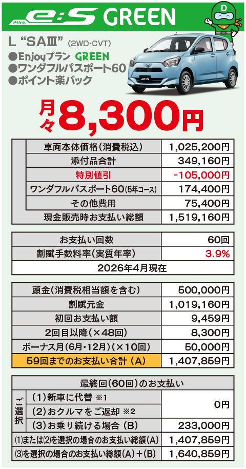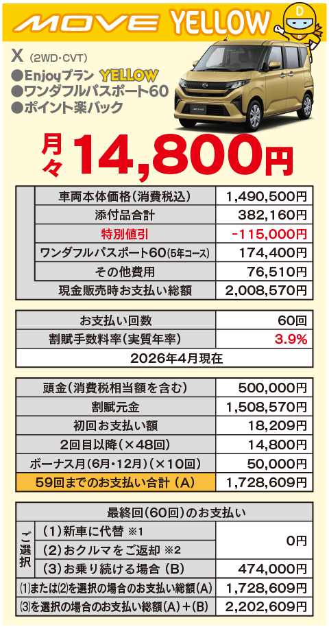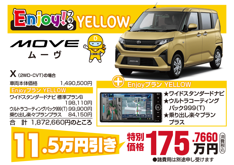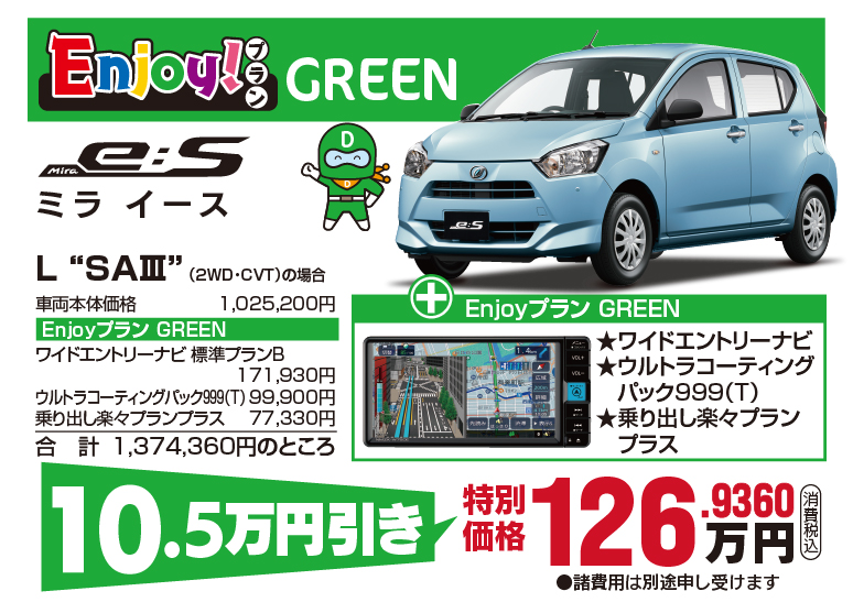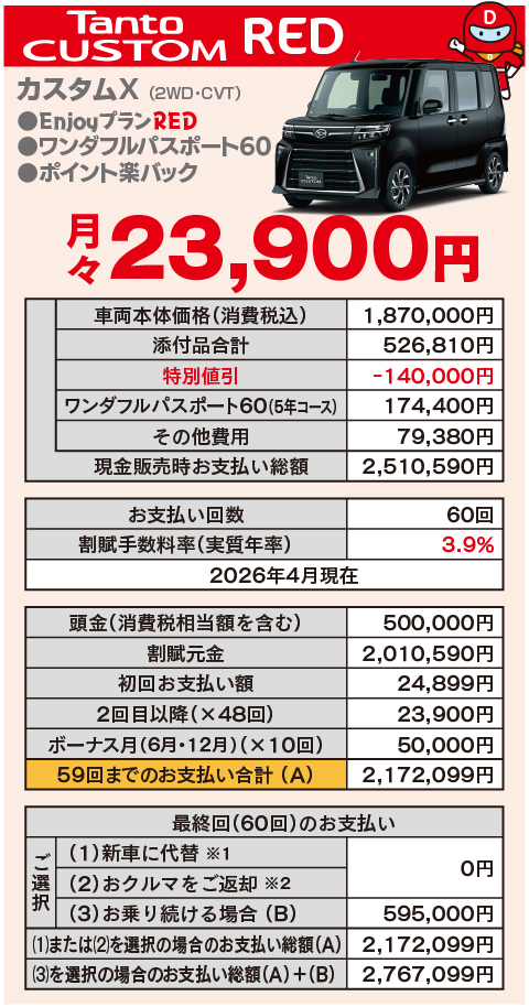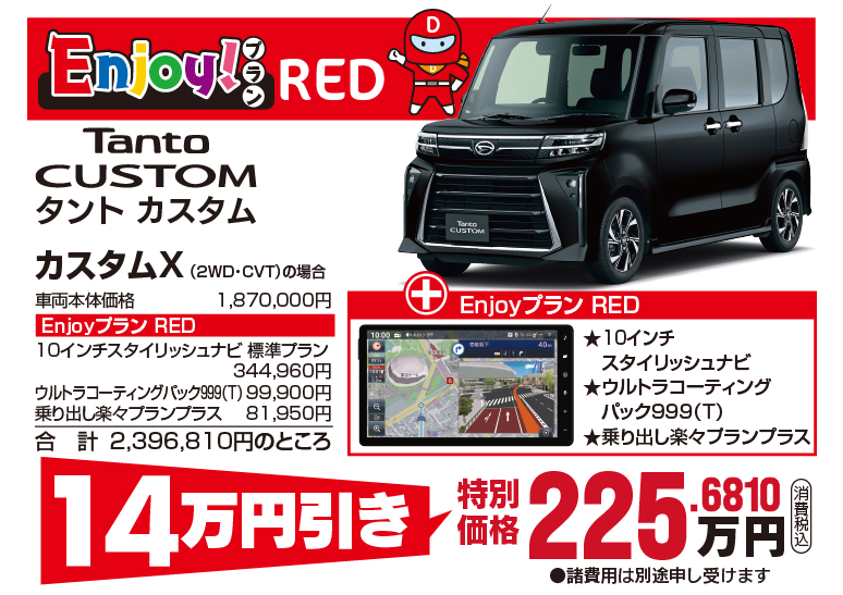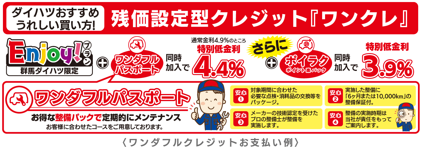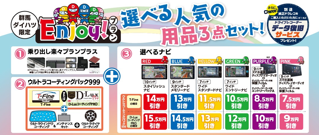 ■PURPLEプランはドライブレコーダーデータ復旧サービスが付属します。■上記、価格はすべて消費税込価格となります。■他のキャンペーンとの併用につきましては店舗スタッフへお問い合わせください。■新車限定となります。■付属品価格は変更になる場合がございます。■既にご成約済の車両にさかのぼって適用することはできません。■車両本体価格はスペアタイヤレス&タイヤパンク応急修理セットおよびタイヤ交換用工具付の価格です。■特別装備以外のメーカーオプション及び取付費は、車両本体価格に含まれておりません。■ドライブレコーダー復旧サービスプレゼント対象のドライブレコーダーは、ダイハツ純正品となります。■ナビ連動タイプのドライブレコーダーだけでなく、ケンウッド製スタンドアローンドライブレコーダーも対象です。■保険料、税金(消費税を除く)、登録料等の諸費用は別途申し受けます。■自動車リサイクル法の施行により、リサイクル料金が別途必要となります。■画像はすべてイメージです。■群馬ダイハツ自動車 限定企画の為、予告なしに終了する場合がございます。予めご了承ください。●詳しくは、スタッフまでお問い合わせください。