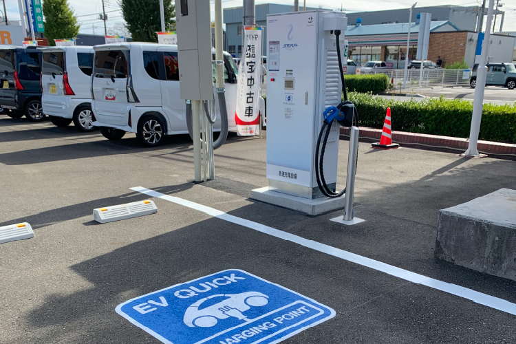 - EV用急速充電器を設置しました。ダイハツ車以外の車両でもご利用できるため、ユーザーの皆さまは、どうぞご利用ください。