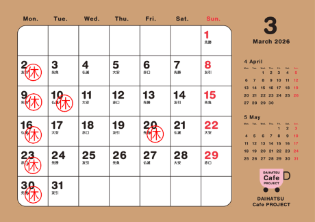 3月は毎週月曜日と10日(火)、20日(祝金)がお休みです🙇