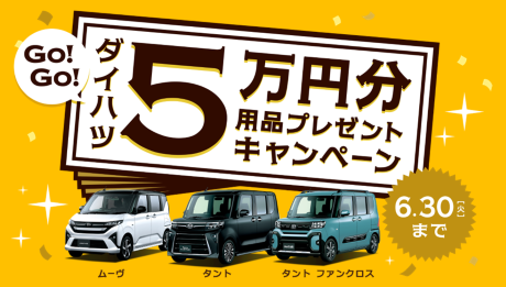 キャンペーン期間中に対象車種(ムーヴ、タント、ファンクロス)と用品5万円(消費税抜)のご成約で用品5万円分を購入金額から割引き!