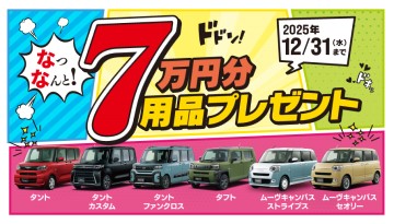 期間中、対象車種の新車をご成約で用品7万円or5万円のプレゼントキャンペーンを実施しております🎊