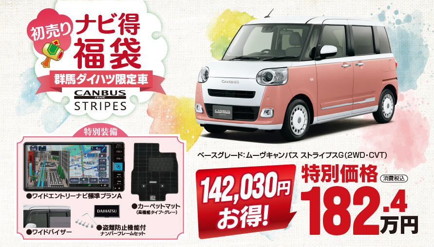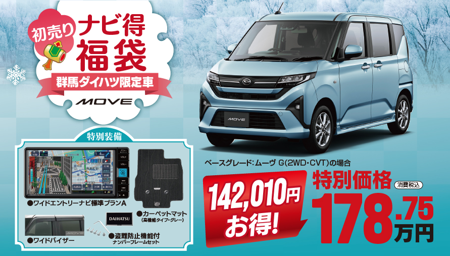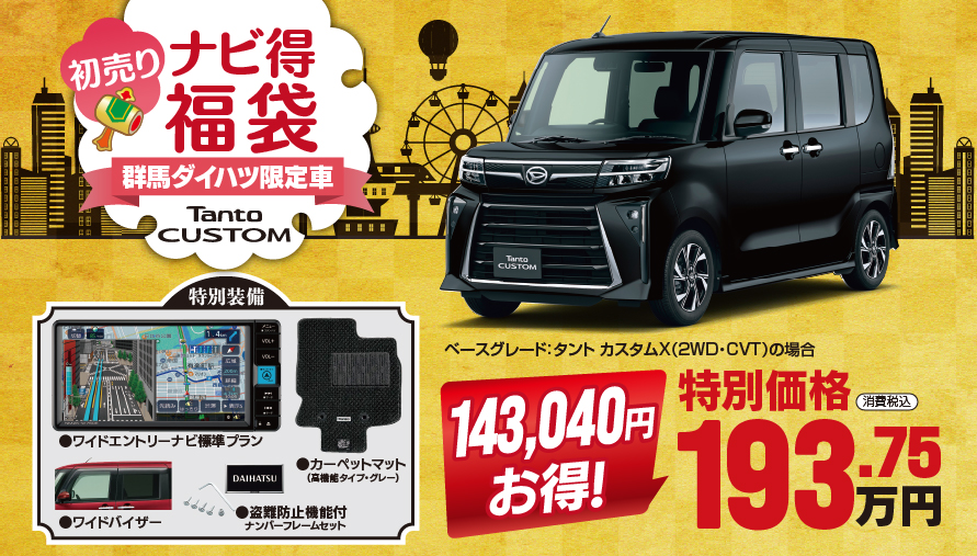 2026年01月04日(日)~01月31日(土)の『大初夢フェア』の開催期間限定で、群馬ダイハツオリジナルの限定車「ナビ得福袋」が登場!