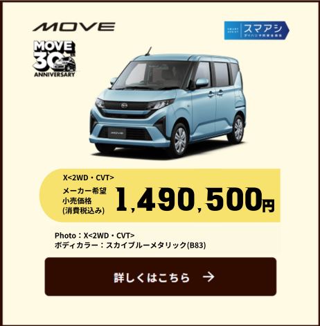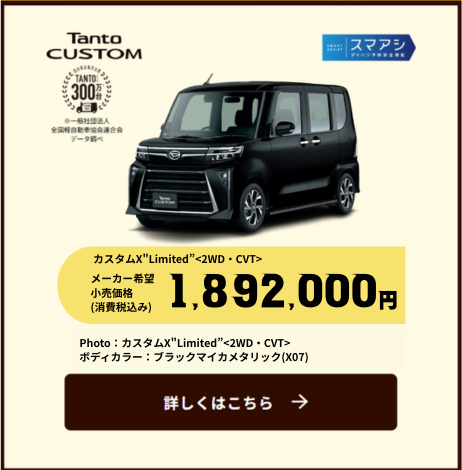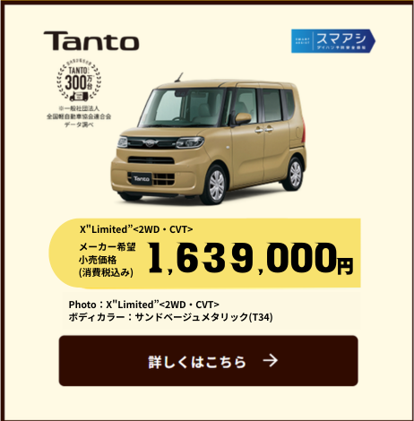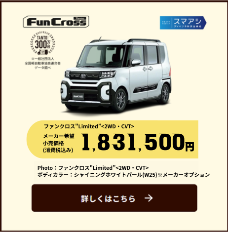 ■2026年4月1日~6月30日までに、タント・タント ファンクロス・ムーヴ(ムーヴ キャンバスは除く)の新車と用品55,000円(消費税込み)をご成約の上、2026年8月末日までに届出いただくことを条件に55,000円(消費税込み)を割引いたします。■新車と同時にご注文いただいた用品の金額が55,000円(消費税込み)に満たない場合は対象外となります。■既に成約済みの車両にさかのぼって適用することはできません。■販売会社によって、期間・内容・条件・対象用品が異なる場合がございます。■一部の店舗では実施していない場合がございます。■営業日は店舗によって異なります。■詳しくは販売会社スタッフへお問い合わせください。