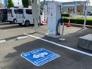 - EV用急速充電器を設置しました。ダイハツ車以外の車両でもご利用できるため、ユーザーの皆さまは、どうぞご利用ください。